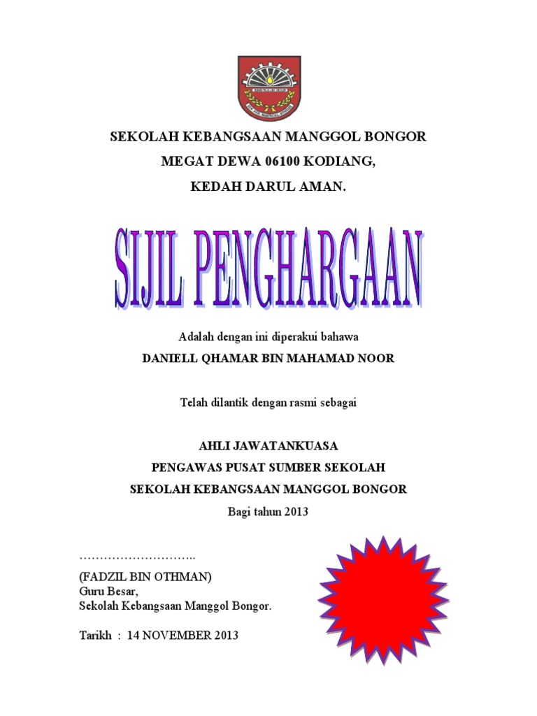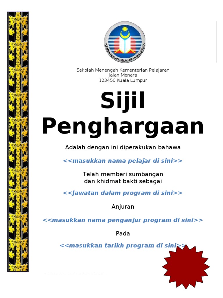 Contoh sijil penyertaan in english. Contoh sijil anugerah pelajar cemerlang. For more information and source, see on this link : Contextual translation of majlis penyampaian sijil penghargaan into english. Sekolah menengah kebangsaan petra jaya, kuching sijil penghargaan mengenang jasa muhamad nur arif bin ahmad 930316135837 atas sumbangan sebagai urusetia dalam pertandingan debat bahasa melayu 2014 anjuran persatuan bahasa melayu sekolah pada 21 hingga 25 september bertempat di smk petra jaya abdul radzak bin ismail pengetua smk petra jaya, kuching